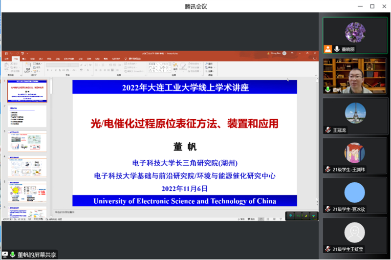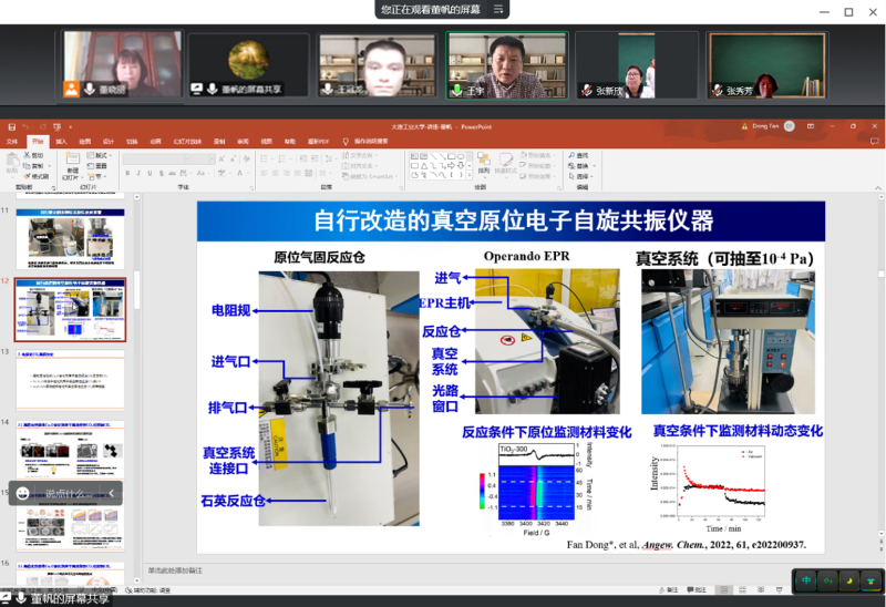 报告结束后,就报告中感兴趣的问题及科研问题与董帆教授进行了线上座谈会。董帆教授对专业教师提出的具体问题给予了耐心地讲解,就现有原位电子顺磁共振装置在水中自由基原位检测方面的应用、钙钛矿量子点的制备应用以及催化剂表面的光致空位生成现象等热点问题给出了自己的看法和意见,切实为91在线